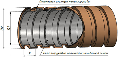 Состоит из негерметичного металлорукава из оцинкованной стали, на внешнюю сторону которого нанесено не поддерживающее горение поливинилхлоридное покрытие.