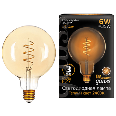Лампа светодиодная декоративная Gauss 158802008 Filament Flexible (G125 шар, 220 В, Е27, 6 Вт, 360 лм, 2400 К), золотистый