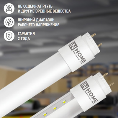 Современные линейные светодиодные лампы IN HOME LED-T8-PRO с цоколем G13 предназначены для освещения бытовых, производственных и административных помещений.