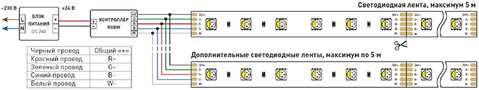 Максимальная длина подключения ленты - 5 метров (1 катушка).