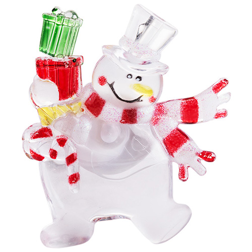 Светодиодная фигурка "Снеговик c подарком" крепится на любые гладкие поверхности при помощи присоски.