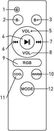 1 - вкл./выкл. светильника. 2 - плавное уменьшение яркости света. 4 - воспроизведение / пауза. 6 - вернуться на один трек назад. 8 - уменьшение громкости звука. 10 - плавный переход к теплому белому цвету свечения. 12 - быстрое переключение цветов свечения: холодный белый - теплый белый - нейтральный белый - ночник. |
