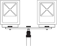 Выкрутите левый и правый барашки консоли. Установите винты в центральное отверстие П-образного кронштейна прожектора. Установите прожекторы на консоль, притяните гайками с обратной стороны. |